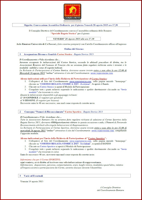 CONVOCAZIONE ASSEMBLEA ORDINARIA "SPECIALE STORICA 2015": VENERDI' 28 AGOSTO ORE 17:30
